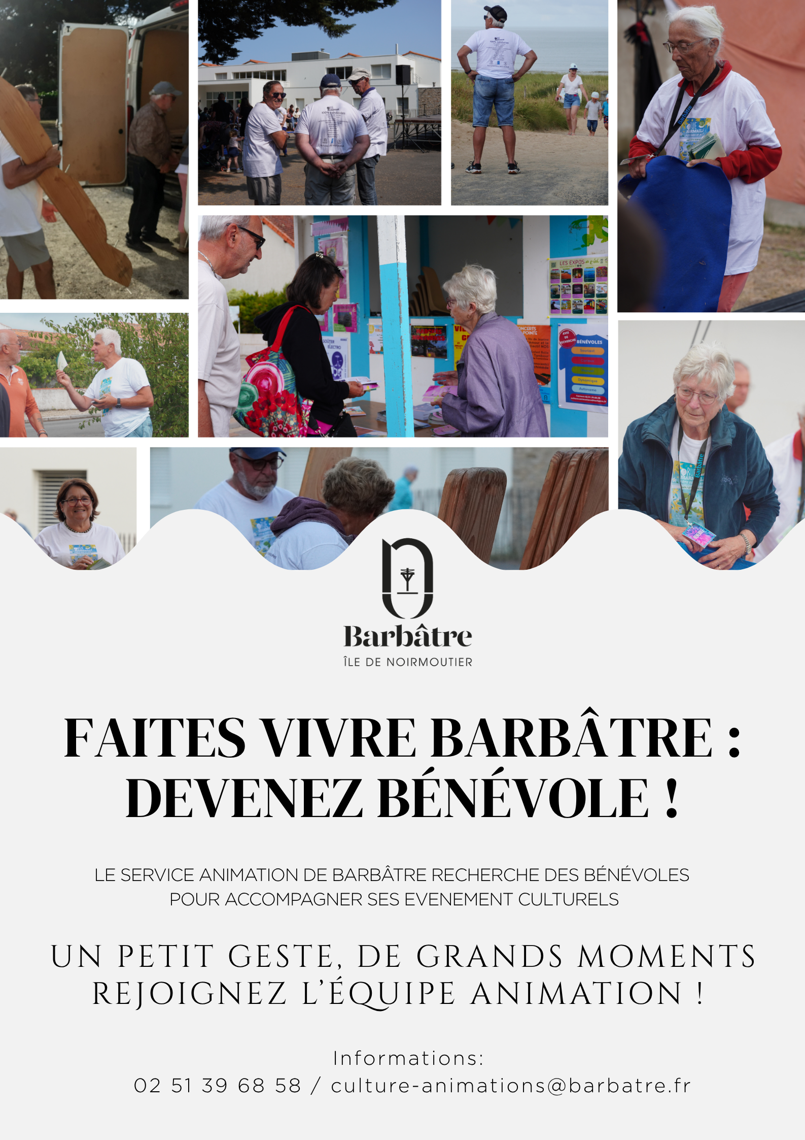 Le service culturel de la Mairie de Barbâtre recherche des bénévoles pour contribuer à l’animation de la commune. D’avril à septembre, tout au long de la saison ou pour un événement ponctuel, rejoignez l’équipe et participez à des moments festifs uniques.